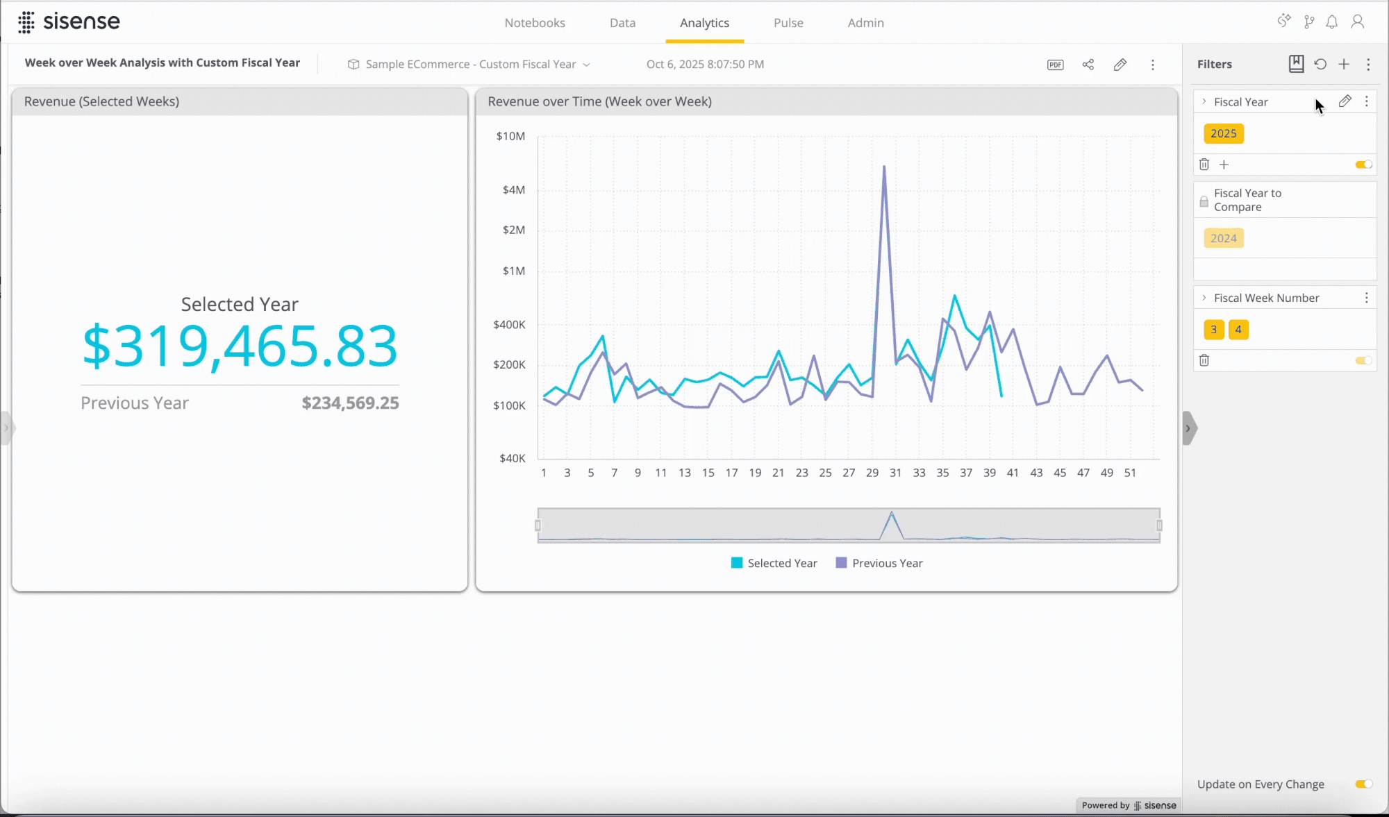 The solution uses the https://www.sisense.com/marketplace/add-on/filtered-measure/ and a custom dashboard script to handle the custom fiscal year. Two year filters are added to the dashboard: one represents the selected fiscal year (user-selectable), and the other represents the prior year for comparison (locked and optionally hidden), which is automatically set with a dashboard script. The Filtered Measure plugin applies the selected-year filter to the measure for the chosen period, while the prior-year filter applies to the measure for the corresponding period in the previous year. This approach ensures that week-over-week calculations respect the custom fiscal calendar, providing accurate comparisons across equivalent weeks.