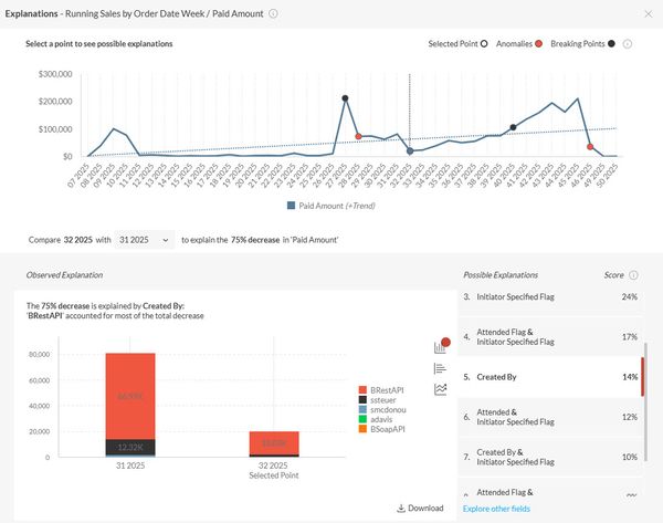 More generally it seems that Explanations just reports back the most highly probably explanations as those fields where the member in the field is the commonly present in the data anyway, and it's just reflecting the raw change in fact data. For example, here's an image where the drop in revenue is explained by the drop in revenue from web sales (BRestAPI). But web sales constitute a larger over proportion of sales after the drop (89% up from 82% in the prior period).
