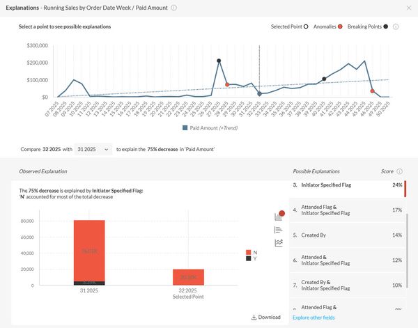 Is there anything we can do to make the explanations discovered by Sisense relevant? The way it's functioning now, it would be better if Sisense DID NOT recommend possible explanations and just let the user Explore Other Fields immediately without having to wait for Sisense to return the list of completely irrelevant fields.