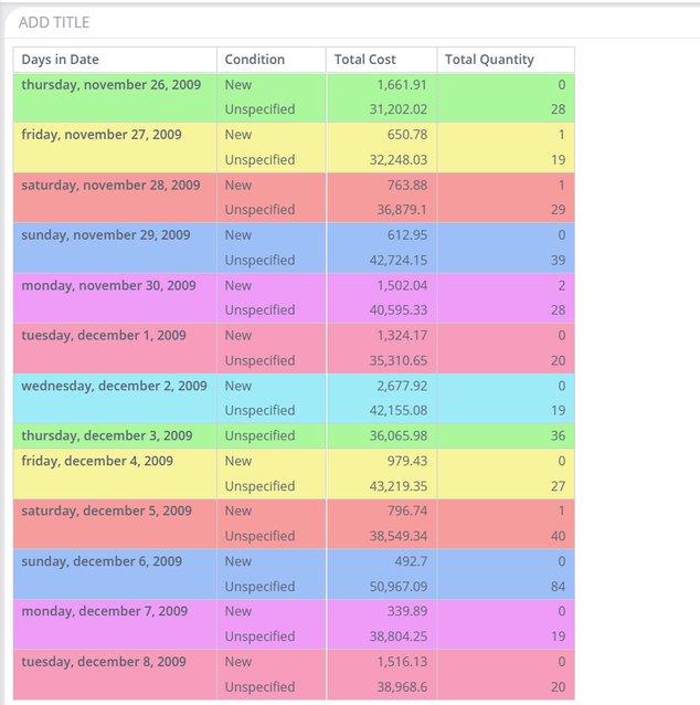 If that's the case, please try the script provided below. This script will work if the date field is the first column in the table.const dayColorMapping = { 'sunday': '#9cbff7', 'monday': '#ee9cf7', 'tuesday': '#f79cba', 'wednesday': '#9cebf7', 'thursday': '#abf79c', 'friday': '#f7f49c', 'saturday': '#f79c9c' } const weekday = ["sunday","monday","tuesday","wednesday","thursday","friday","saturday"]; const dateColumnIndex = 0; widget.transformPivot( { }, function setCellBackground(metadata, cell) { if(metadata.rowIndex > 0){ const date = new Date(metadata.rows[dateColumnIndex].member); const day = weekday[date.getDay()]; if(day in dayColorMapping) { cell.style.backgroundColor = dayColorMapping[day]; } } } );Result: