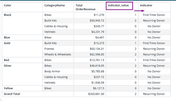 // Specify the target value/measure column to modify const myTarget = { type: ['value'], values: [ { title: 'Indicator' // Name of the column to apply the transformation to } ] }; // Apply a transformation to each cell in the selected pivot column widget.transformPivot(myTarget, function(metadata, cell) { if (cell.value == 1) { cell.content = "First-Time Donor"; // Replace numeric value with descriptive label cell.style = { "text-align": "center", // Center text horizontally "padding-left": "5px" // Add spacing on the left side }; } else if (cell.value == 2) { cell.content = "Recurring Donor"; cell.style = { "text-align": "center", "padding-left": "5px" }; } else { cell.content = "No Donor"; cell.style = { "text-align": "center", "padding-left": "5px" }; } });Example of the Indicator_value converted to Indicator text