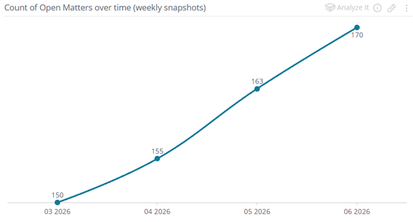 (COUNT([Matter Number]),[Matter Event Type (filtered to "Open")],[Weeks in Matter Event Date (filtered to all weeks PRIOR to the last 4 weeks)])