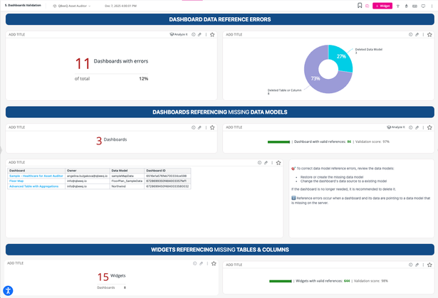 And it doesn't just stop at the data models! We also display which dashboards are throwing errors, and help narrow down the root cause. We also give you visibility into access and sharing of dashboards/models, also, widgets and plugins.