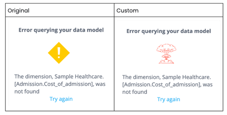 Custom error notification image This article explains how to develop the plugin to replace the default error image. Of course, in ideal world there are no errors, but who does live in the ideal one? As a result of this article’s implementation, we will accomplish the following: ALT Text: A comparison table with two columns titled "Original" and "Custom." Each column contains the same message about an error querying a data model, mentioning a specific dimension related to healthcare. The "Original" message features a yellow warning icon, while the "Custom" message has a red explosion icon. Both messages prompt the user to "Try again." To accomplish this we will develop a new plugin. For more details about plugin development please check this article: https://community.sisense.com/t5/knowledge-base/plugin-dev-tutorial/ta-p/9087 To create a new plugin we will need to do the following: Use file manager to navigate to the folder ‘plugins’; In the folder ‘plugins’ create a new folder and name it ‘updateErrorLogo’; Open the newly created folder and create two files: main.6.js; plugin.json. Open the file ‘plugin.json’ and paste there the following content: { "name": "updateErrorLogo", "source": [ "main.6.js" ], "lastUpdate": "2025-01-10T22:36:03.764Z", "folderName": "updateErrorLogo", "isEnabled": true, "version": "1.0.0", "skipCompilation": true, "pluginInfraVersion": 2 } 5. Open the file `main.6.js’ and paste there the following code: //Import your image. Value of the variable newErrorSvg is internal URL to the image import newErrorSvg from './newErrorSvg.svg'; //Subscription at the loading directive slfQueryErrorBrand mod.directive('slfQueryErrorBrand', [ () => { return { restrict: 'C', link: async($scope, lmnt, attrs) => { $(lmnt).hide(); //Hiding default logo await fetch(newErrorSvg).then((response) => { //Load SVG return response.text().then(svgContent => { //Convert response into text lmnt[0].innerHTML = svgContent; //Replace default content with our custom one }); }).catch((error) => { console.error('Error loading SVG:', error); }).finally(() => { $(lmnt).show(); //Show logo }); } }; } ]); 6. Place an image with the name ‘newErrorSvg.svg’ you want to be shown instead of the default. Now, after the plugins rebuild you will see your new image instead of the default one. Enjoy your customized error image. In the attachment, you can find the completed plugin.646Views2likes0CommentsHow to change the color of the JumpToDashboard icon in Sisense on Linux