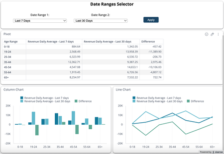 In certain scenarios, users may need to compare the same metric across two different time periods. Here are some example use cases: Sales velocity: Comparing average daily sales for the last 30 days vs. the last 90 days to identify if recent promotions are boosting sales. Customer acquisition: Comparing the number of new customers acquired in the last 90 days vs. the last 180 days to measure growth acceleration. Website or app traffic: Comparing page views or active users over the last 7 days vs. the last 30 days to see the impact of recent campaigns or updates. Inventory turnover: Comparing inventory sold in the last 30 days vs. the last 60 days to determine if demand is increasing or if there's overstock. These time periods need to be dynamic and selectable, which means hard coding them as measured values (filter on formula) in the widgets will not work. One possible solution for this requirement is to duplicate the date field in the data model, and create two date filters (one for each time period) on the dashboard. The main drawback of this approach is that you will need two different widgets, one for each time period. Otherwise, the two filters will conflict/combine. The first date filter needs to be disabled in the second widget, and similarly, the second date filter needs to be disabled in the first widget. A better solution is to use BloX to provide two date range selectors and apply the selections to the formula's measured value dynamically. This way, you can use a single widget to compare the metric across two different time periods. Here is an example: ALT text: A data visualization interface titled "Date Ranges Selector." It includes a date range selection option, with fields for "Date Range 1" and "Date Range 2," labeled 'Last 7 Days' and 'Last 30 Days.' Below, there is a pivot table displaying age ranges (0-18, 19-24, 25-34, 35-44, 45-54, 55-64, 65+) along with three columns: "Revenue Daily Average - Last 7 days," "Revenue Daily Average - Last 30 days," and "Difference." Two charts, a column chart on the left and a line chart on the right, represent the revenue averages for the specified age groups over the two date ranges. A working dashboard example, along with the cube can be found in the links below. Please note that once imported, the cube still needs to be built. Dashboard: BloX - Multiple Date Range Selectors for KPI Comparison Elasticube: Sample ECommerce - Current Dates Implementation This BloX custom action allows users to select two date ranges and compare the KPI in those two periods, e.g. average daily revenue in the last 30 days vs. the last 90 days. The KPI doesn't necessarily have to be the same. For example, you can compare Revenue in the last 30 days vs Cost in the last 60 days. This custom action supports Pivot and Cartesian charts (column, bar, line, area). Instructions: Create the BloX widget. Download and use the attached template (KPI_Benchmarker-2024-12-31.json). Make changes as needed. The attached template includes 9 date range choices in the dropdown menu: 7 days, 15 days, 30 days, 60 days, 90 days, 120 days, 180 days, 360 days, 365 days. Add/remove the choices and make other changes as needed. Add the custom BloX action. Add the custom action at the end of this article to your environment: copy the entire code, create a new BloX custom action in your environment, and paste the code into the new action. Name the action DateRangesSelectorForKPIComparison. If you choose to use a different name, you have to update the BloX code to reflect this change. Create the widget(s) where you want compare the KPI. Add the first formula to the Values panel with a measured value on a date field set to the last any arbitrary number of days, e.g. (SUM(Revenue), Days in Date), where Days in Date is set to Last 30 days. Rename the KPI title to any text, but include "Last xx days" in the title, e.g. "Revenue - Last 30 days". The BloX action will automatically update the number in the title to reflect user selection. Add the second formula to the Values panel following the same instruction as step #3a, e.g. (SUM(Revenue), Days in Date), where Days in Date is set to Last 60 days. Rename the second KPI following the same instruction as step #3b, e.g. "Revenue - Last 60 days". Add any arbitrary formula (it can also be a hard-coded value like 0) to the Values panel as a placeholder for the third formula, i.e. the delta calculation. The BloX action will automatically replace the formula with the delta calculation. Create the next widget(s) as needed. Add all widget IDs that you want to apply this custom action on in the BloX code under the widgetToModify parameter, then click Apply to save the widget. Test the BloX widget by selecting the first and second date ranges from the dropdown boxes, then hit Apply. DateRangesSelectorForKPIComparison custom action: //initialize variables var widgetIds = payload.data.widgetToModify; var filterValue1 = payload.data.selectVal1; var filterValue2 = payload.data.selectVal2; //loop through each of the specified widgets payload.widget.dashboard.widgets.$$widgets .filter(i => widgetIds.includes(i.oid)) .forEach(function (widget) { var newMeasure1Title = widget.metadata.panels[1].items[0].jaql.title.replace(/Last .*? days/, "Last " + filterValue1 + " days"); var newMeasure2Title = widget.metadata.panels[1].items[1].jaql.title.replace(/Last .*? days/, "Last " + filterValue2 + " days"); /***** Date Period 1 - Set date measured value for the first calculation *****/ //check if the panel item contains context (i.e. a formula) if (widget.metadata.panels[1].items[0].jaql.context != undefined) { //get the JAQL context of the panel item var queryContext = widget.metadata.panels[1].items[0].jaql.context; //loop through each context in the item for (let [k, v] of Object.entries(queryContext)) { //find the context that contains the date measured value if (v.filter != undefined && v.datatype == 'datetime') { //update the date measured value v.filter.last
