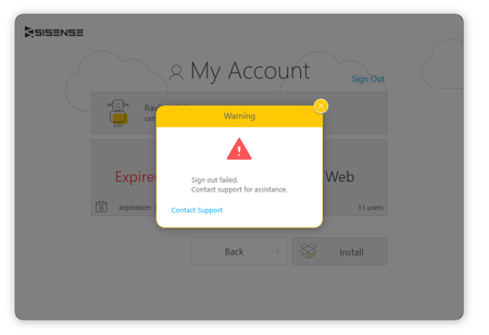 Question: Sisense installation on Windows server stuck at 20% install and then the installer fails: In the %temp% install logs we saw the following errors: Error 0x80070570: Failed to extract all files from container, erf: 1:4:0 Error 0x80070570: Failed to begin and wait for operation. Error 0x80070570: Failed to extract payload: a3 from container: WixAttachedContainer Answer: This error indicates a corrupted install file or inability to access the %temp% folder where the extracted install files are temporarily written to. The file could be corrupted from copying from another machine or by antivirus software installed on the machine when downloading the installer. Often this issue can be resolved by re-downloading the install file directly to the server from this list: Sisense Release Versions. Before re-running the installer it is also recommended to remove the Sisense folder from %ProgramData% and %ProgramFiles%. If these steps do not resolve the issue, please create a support ticket and our TSE team will be able to assist.1KViews0likes0CommentsUnable to sign out from my existing license login - Sign out failed